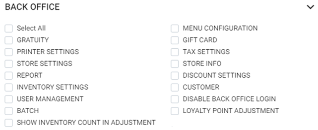 - USER MANAGEMENT - Access to User Management details (Create Roles / Users / Tip Adjustment / Forced Punch In/Out)
