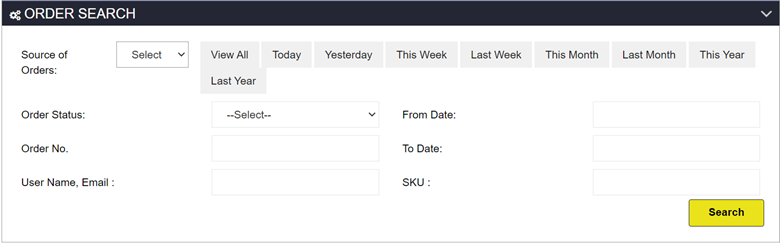 Selectone or more of the following filter options: Order Status, Order No., User Name/Email, From and To Dates, and SKU.