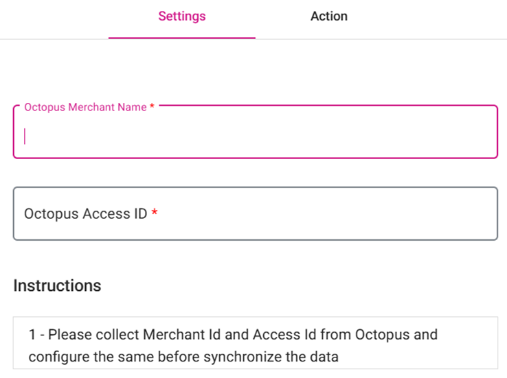 Enter the Access ID (provided by Octopus), which is unique for the store. Note: The onboarding and initial configuration on the Octopus side will be handled by the Octopus team. Octopus merchant credentials (Merchant Name and Access ID) provided by the Octopus team.