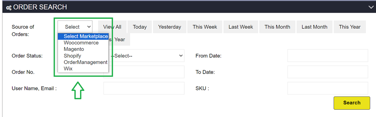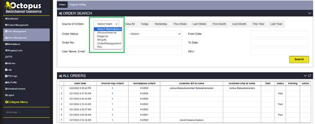 Source of Orders - Selecting the dropdown displays the store's configured marketplace marketplaces/websites through which the customer places their order, allowing you to view the corresponding orders from that source.