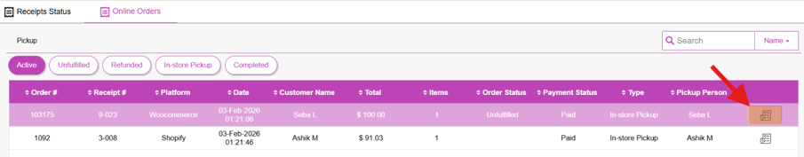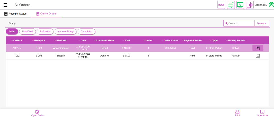 Note: If you cancel or refund an order on the third-party order side (e.g., WooCommerce), the Status is automatically sent to UPOS and the Order Status is updated to Refunded. Currently this applies to only Unfulfilled orders on the POS.