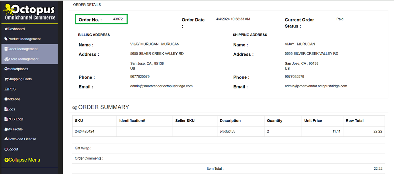 Once the Order is placed in WooCommerce, Shopify, or another sourceby the customer: it will automatically appear in Octopus, under the Order Management screen: