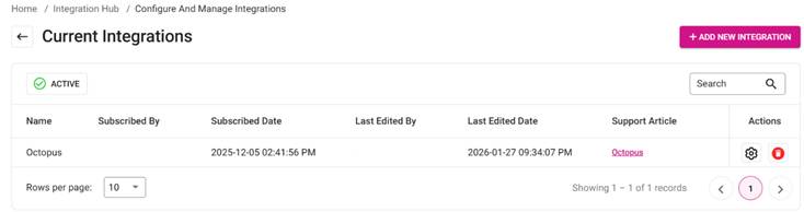 On the Current Integrations page: navigate to the row with Octopus, then under the right-side Actions column select the settings (gear) icon.