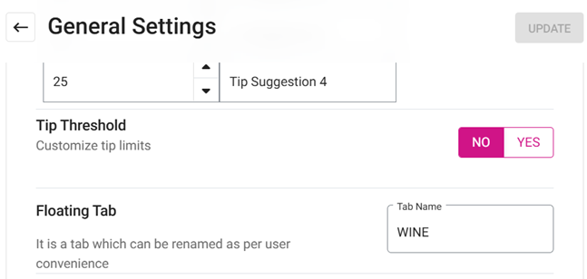 Use the Tab Name field next to Floating Tab to rename the Bar Tab to the desired name. Limit of 15 characters.