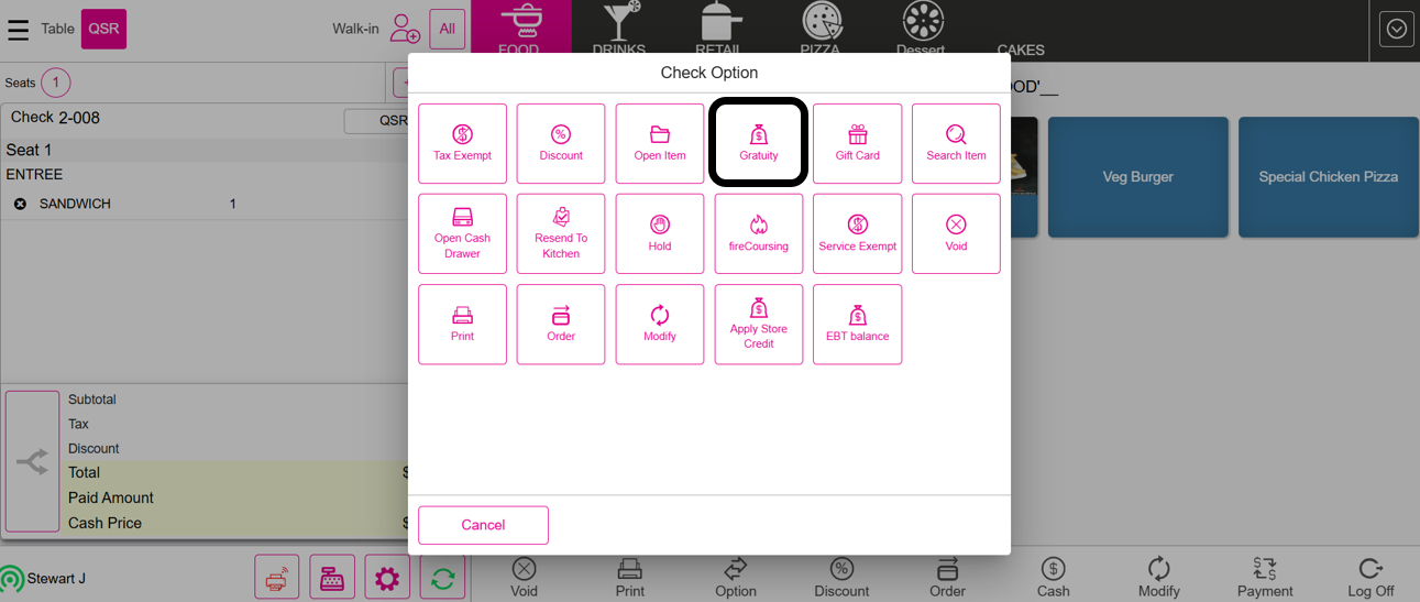 - When selected, the respective Gratuity will be applied to the Check. If selected again, the applied Gratuity will be removed from the Check.