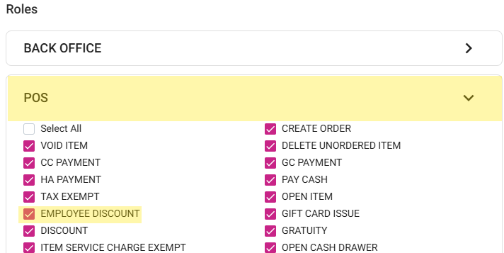 When creating a new Role or updating an existing Role, the Employee Discount checkbox option will be included under the expanded POS dropdown section.