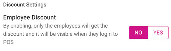 When creating or updating any of the above type Discounts, the Employee Discount toggle is available and will be disabled (set to NO) by default.