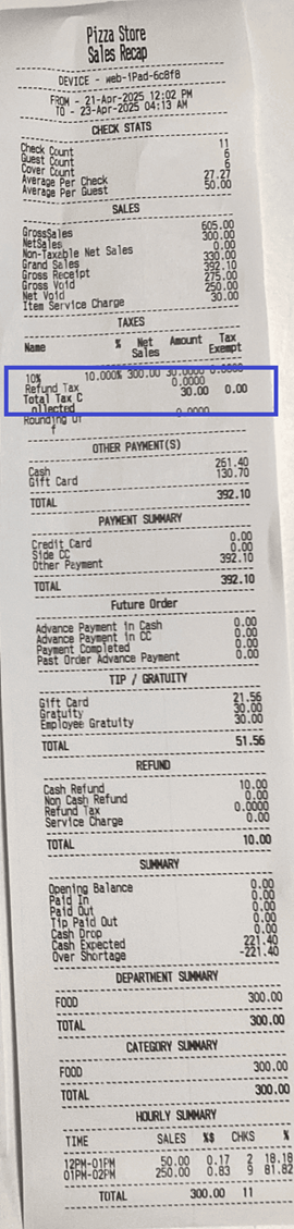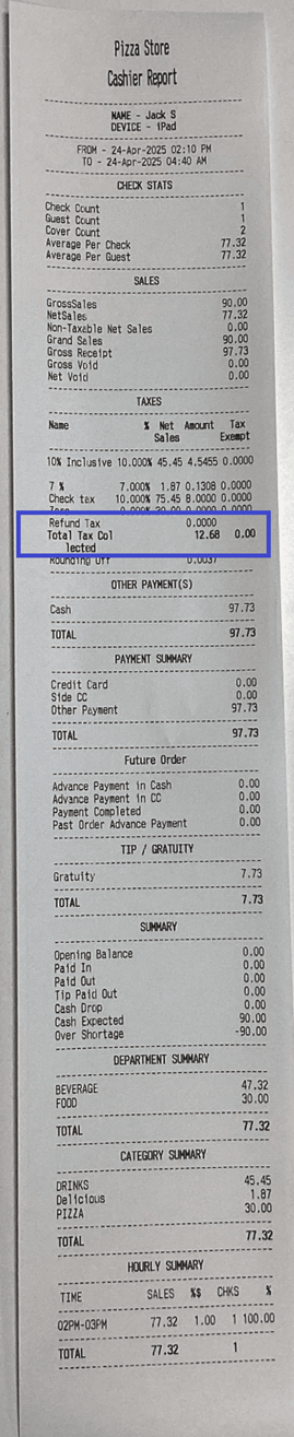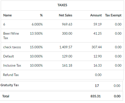 All the Tax collected for Gratuity will be totaled and appear as Gratuity Tax on the report.