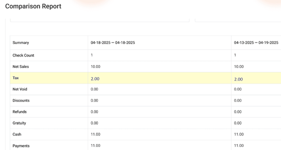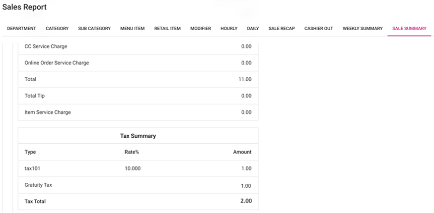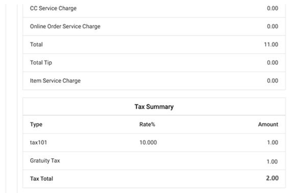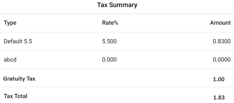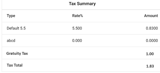 Example: If the Tax is $1 and the Gratuity Tax is also $1, the Tax amount will be calculated as $1 + $1 = $2.