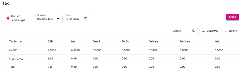 Select the appropriate filters, then click Apply. The report will appear. The Tax field will include the Tax configured for Gratuity (as-usual).