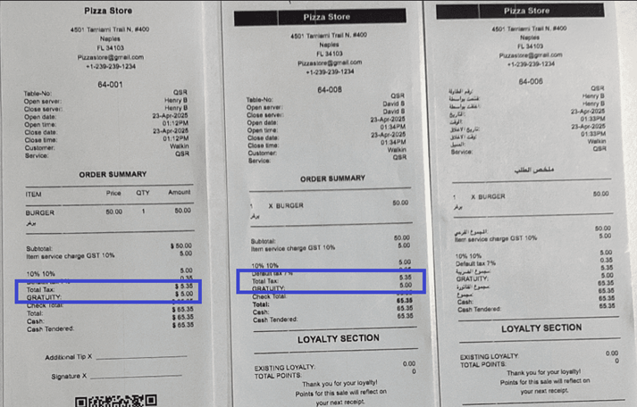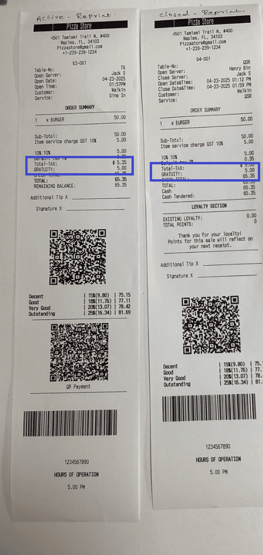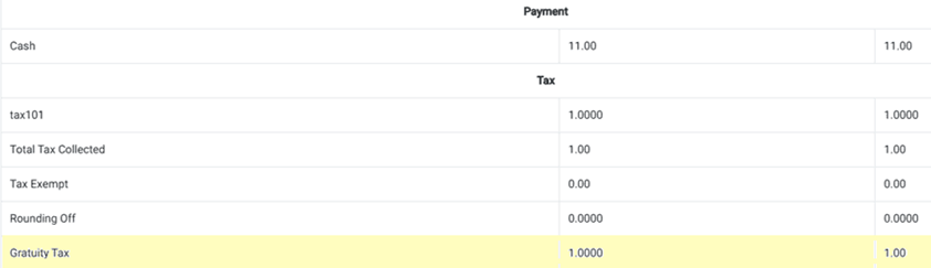 Example: If the Tax is $1 and the Gratuity Tax is also $1, the Gratuity Tax amount will be calculated as $1 + $1 = $2.