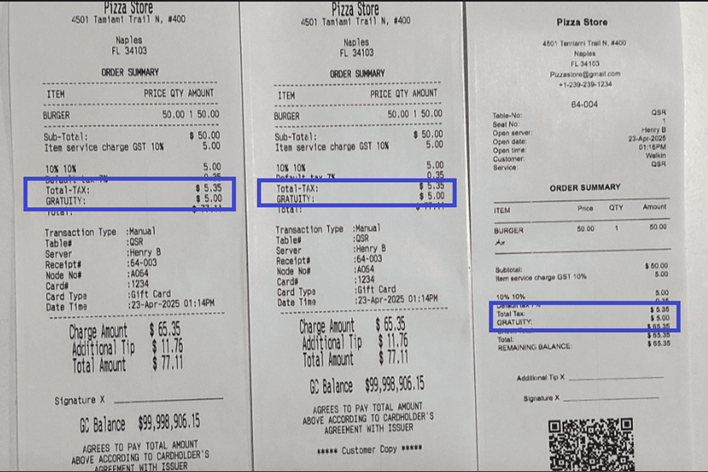 Example: If the Tax is $1 and the Gratuity is also $1, the Tax amount will be calculated as $1 + $1 = $2.
