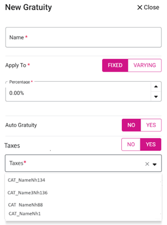 The toggle Taxes appears below Auto Gratuity. Upon enabling the toggle, the Taxes drop down will appear where you can choose the list of previously-configured Taxes.