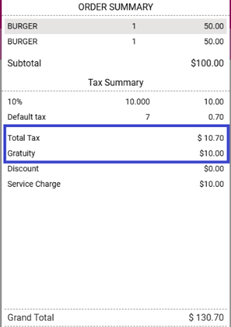 In POS, Gratuity Tax will be displayed based on the calculation. An example is below: