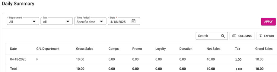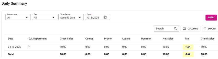 Select the appropriate filters, then click Apply. The report will appear. The Tax will include the tax configured for Gratuity (as-usual).