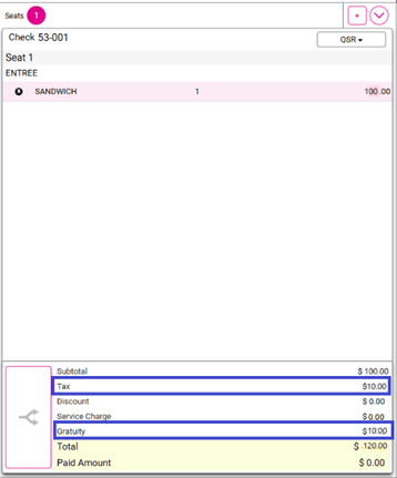 Split Seat – The Gratuity Tax (%) should be calculated and split for the Gratuity amount of menu items, and it should be added to the Tax (Total Tax) evenly as per seats.