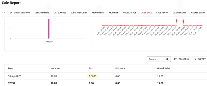 On the Daily Sale report: select a Time Period then click Apply. The report will appear, and all the Tax collected for Gratuity will be totaled and appear as GratuityTax.