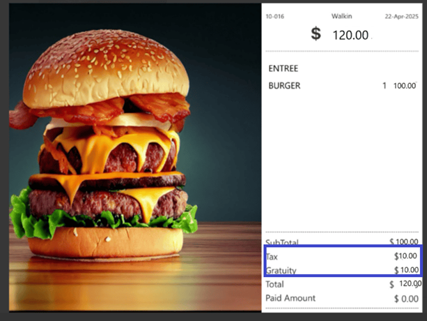 Merge – The Gratuity Tax (%) should be calculated for the Gratuity amount of the menu item and it should be added to the Tax (Total Tax).