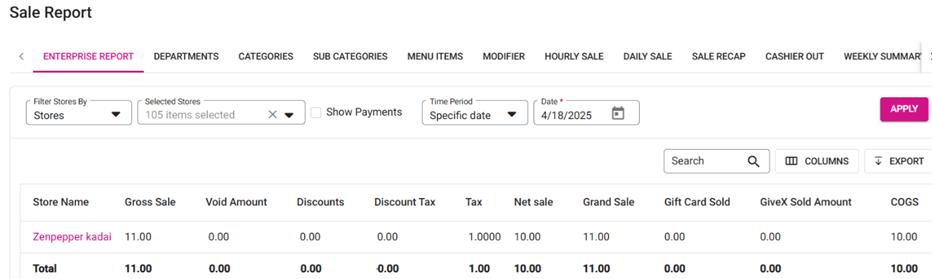 Navigation: Log into the BO for your Store, then select Enterprise > Enterprise Reports > Sale > Daily Sale