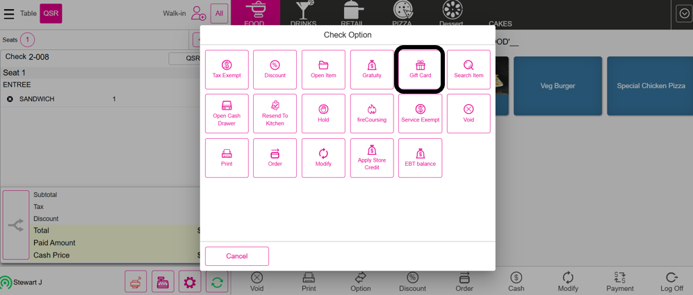 Note: Only Employees with the proper Role and Permission settings have access to issue Gift Cards or GiveX Cards. Otherwise, the Gift Cards option will be disabled on the Check Options screen.