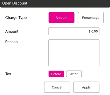 - If a role which does not have access to apply the discount: the open check discount field won’t appear for the role (the Open Check Discount option should not be available in POS for the user).