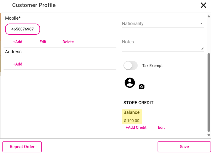 - Once the Store Credit is added, the new Balance will be added to that Customer and will appear on the Customer Profile screen.