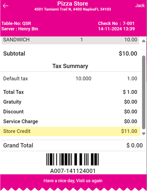 Select a Customer then a pop-up containing their Receipt will appear. Any Store Credit will appear as a line item under the Summary details.