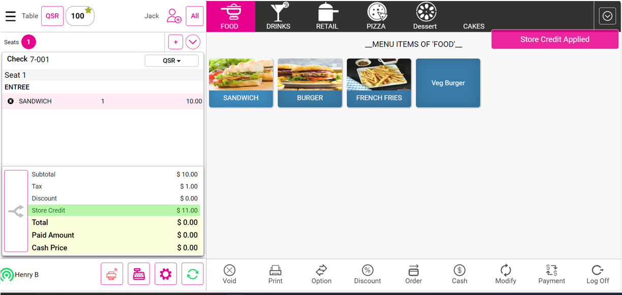 - Click Apply Credit. You are returned to the Order screen, where the 'Store Credit Applied' pop-up appears at the top-right (click the X to close) and the Amount will be added as the Store Credit line item.