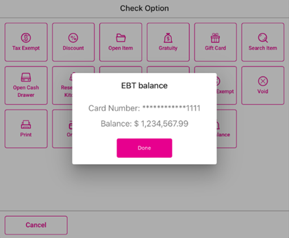 The EBT balance pop-up appears, showing the Card Number (with all but last 4 numbers hidden) and the Balance. Click Done to close the pop-up.