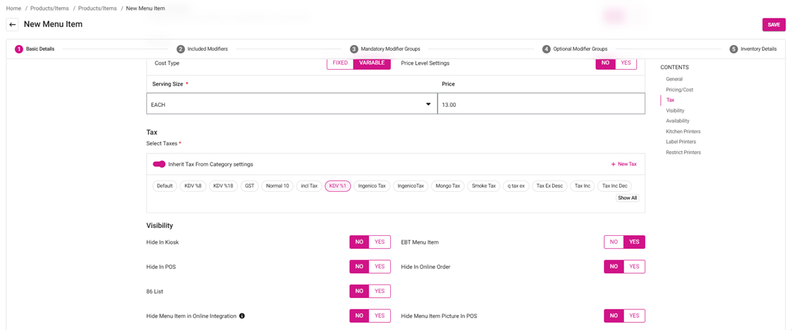On the (1) Basic Details page under the Tax section, enable the EBT Menu Item toggle (set to YES), then click Save at the upper-right.