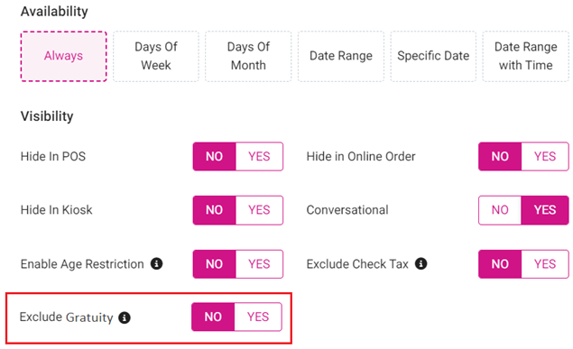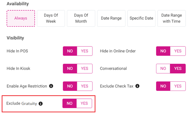 - If Yes is selected, the Exclude Gratuity toggle will be enabled for both Category and Subcategory