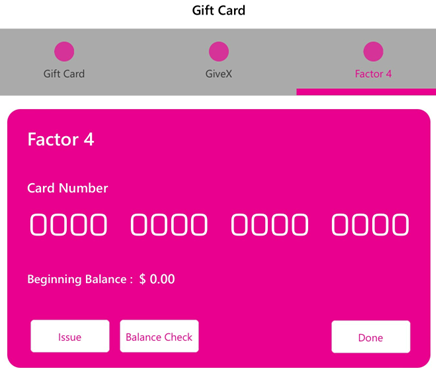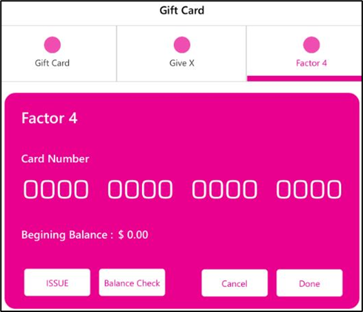 The new Factor 4 tab appears on the Gift Card screen (Factor 4 is the default option when selected under POS Settings). When selected, the screen displays the Card Number and Beginning Balance, with the following button options: