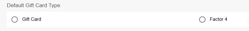 The Factor 4 appears as an option under the Default Gift Card Type section. When selected, it will appear as the default on the Gift Card screen in POS (Check Options > Gift Card).