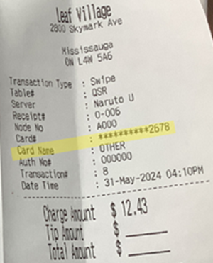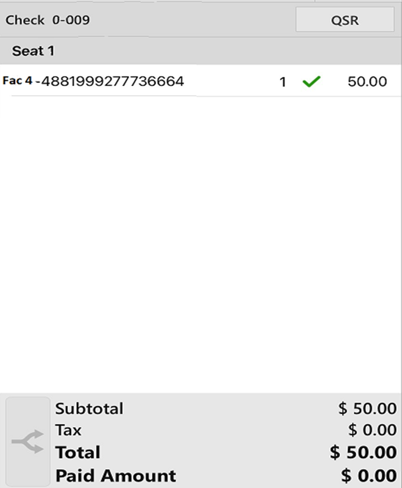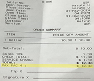 When payment is completed using a Factor 4 card, the net Amount paid appears as the Pax Fac 4line item below the Total.