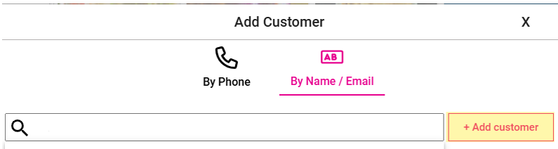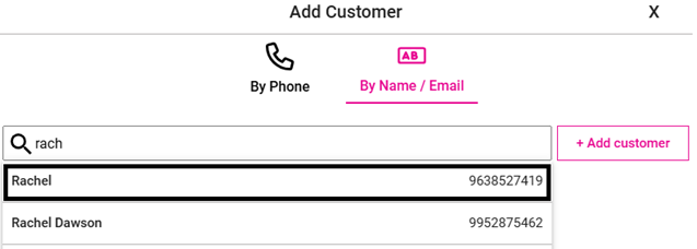 On the Add Customer page, search for the existing Customer by entering their Phone number or Name/Email. Identify the Customer from the dropdown results and click it.