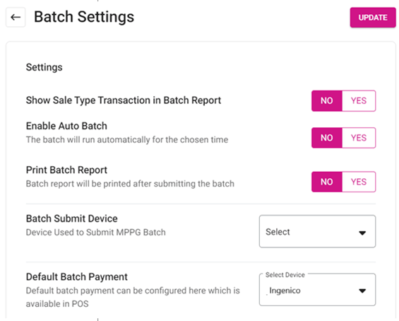Batch Submit Device - select the device used to process batch payments including Ingenico.