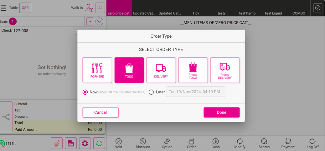 If the POS Initial screen in the Back Office is configured as POS Screen, then after logging into the application you will be taken to the Order screen. If the Order Type is enabled on the POS Settings screen, then the Order Type pop-up appears with ...