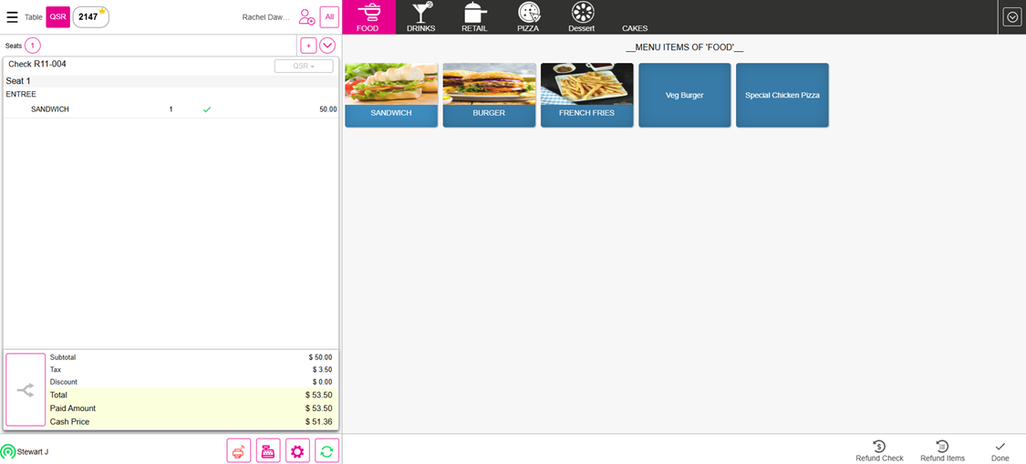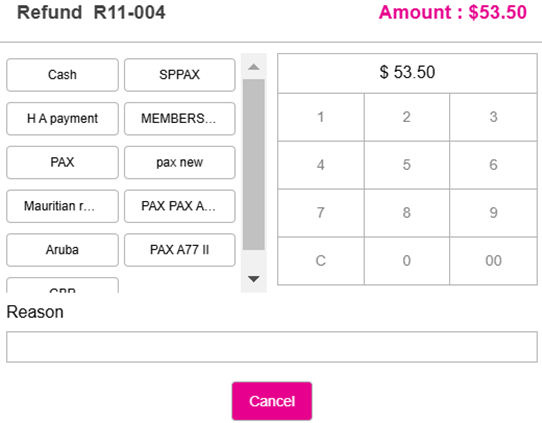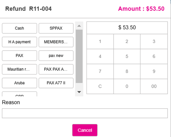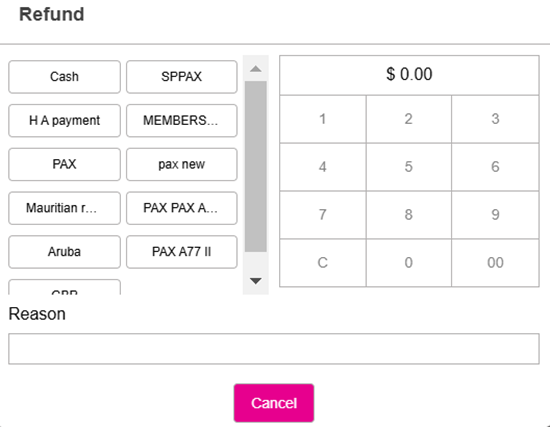 Refund Items - You can refund a particular menu item price. Select the menu item to be refunded, then provide a Reason for payment type. The Amount to be refunded will appear on the pop-up.