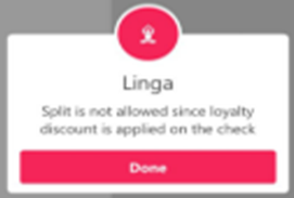 When attempting to split by Seat or Check, a pop-up with the message 'Split is not allowed since loyalty discount is applied on the check' appears. Click Done to close the pop-up.