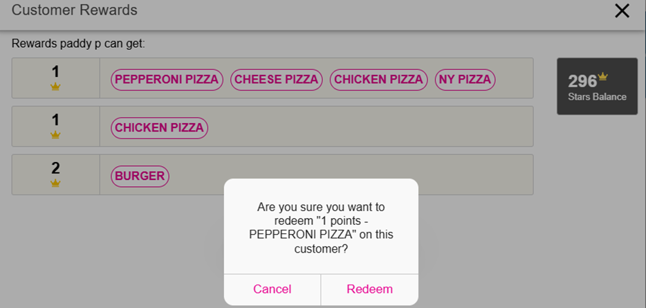 When any Menu Item selected, a pop-up with the message ‘Are you sure you want to redeem “[#] points – [Menu Item Name]“ on this customer’ appears. Select whether to confirm to Redeem the pointsor Cancel the request.