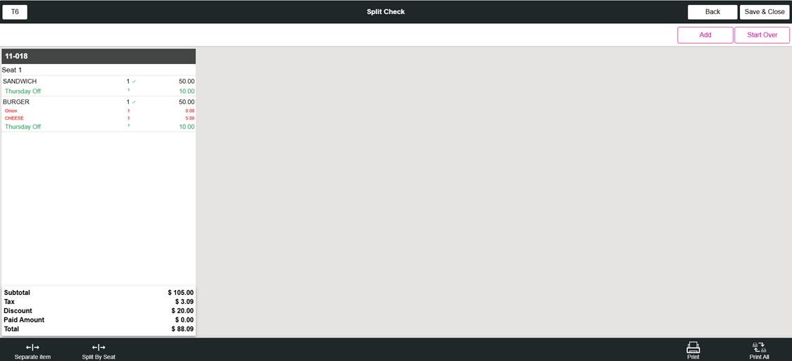 The selected Menu Item will get split, and the corresponding Quantity and Price will be divided accordingly, and this applies to the loyalty discount.