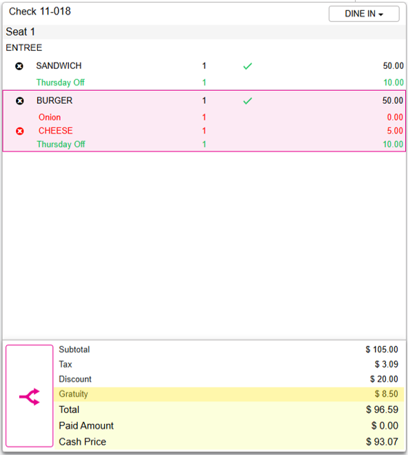 Any proportional Gratuity applied to the Check will be displayed in POS.