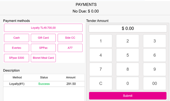 Upon clicking on Loyalty payment, the Total amount will be paid via subtraction from the Loyalty amount and the Status will appear as Success.