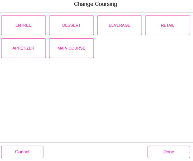 Back Office See the Coursing Knowledge Article POS Select a Menu Item. The Menu Item's related Coursing will appear. Example: Beverages is the name of the Coursing and where the Menu Item Coffee Milk has been selected. Once a Menu Item is selected, ...