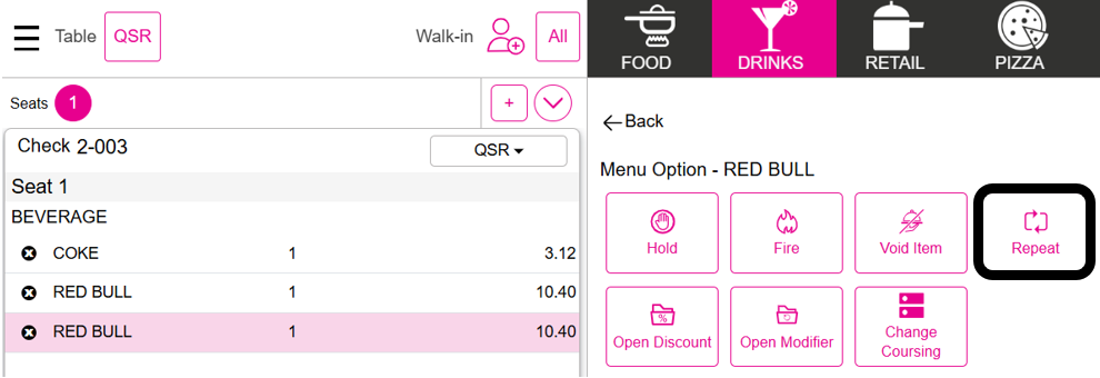 When a Menu Item is 'Fired', that selected Item will be sent to the Kitchen immediately. To Fire a Menu Item on a Check: On the Menu screen, select a Menu Item. On the Menu Option menu that appears to the right, select Fire. A green check mark will ...