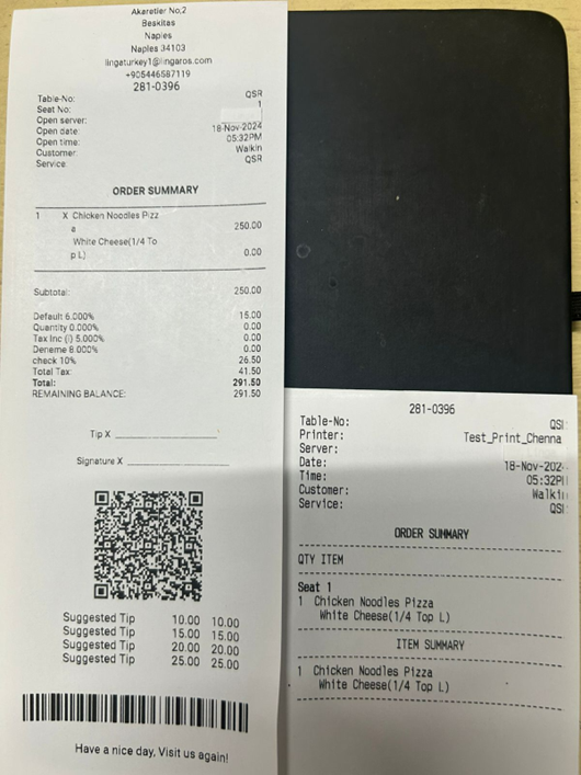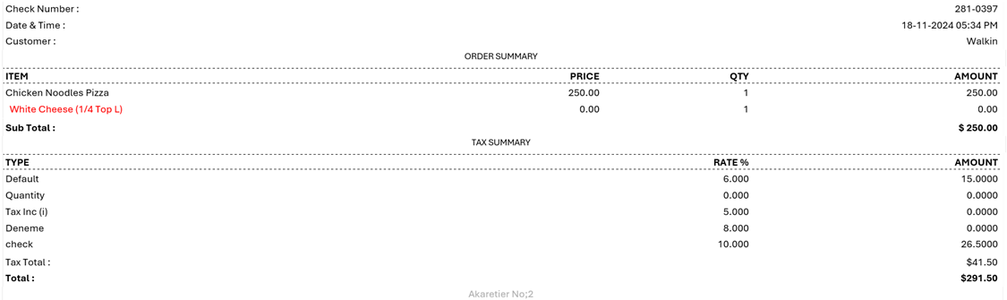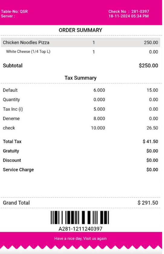 Upon clicking on Tax, you will be able to view the table where the Parent Modifier Configuration will be reflected in Net Sale amount and tax need to be calculated based on the price and tax configured in BO. (In this tax, the Parent Modifier Configuration price should be included).