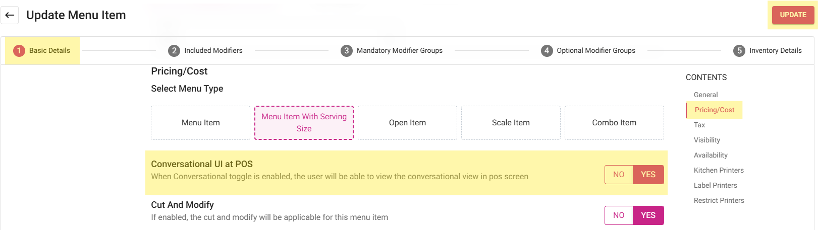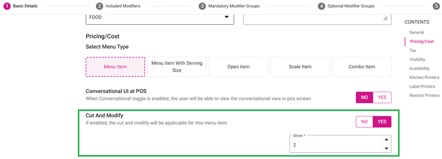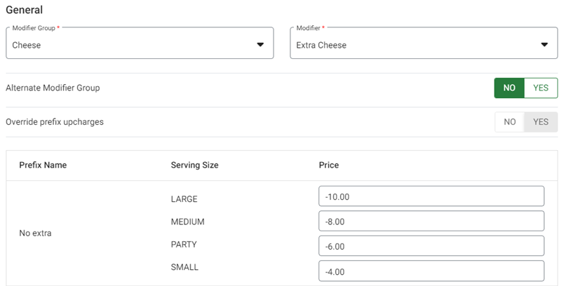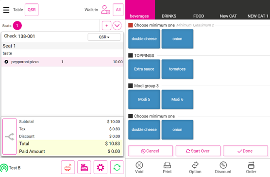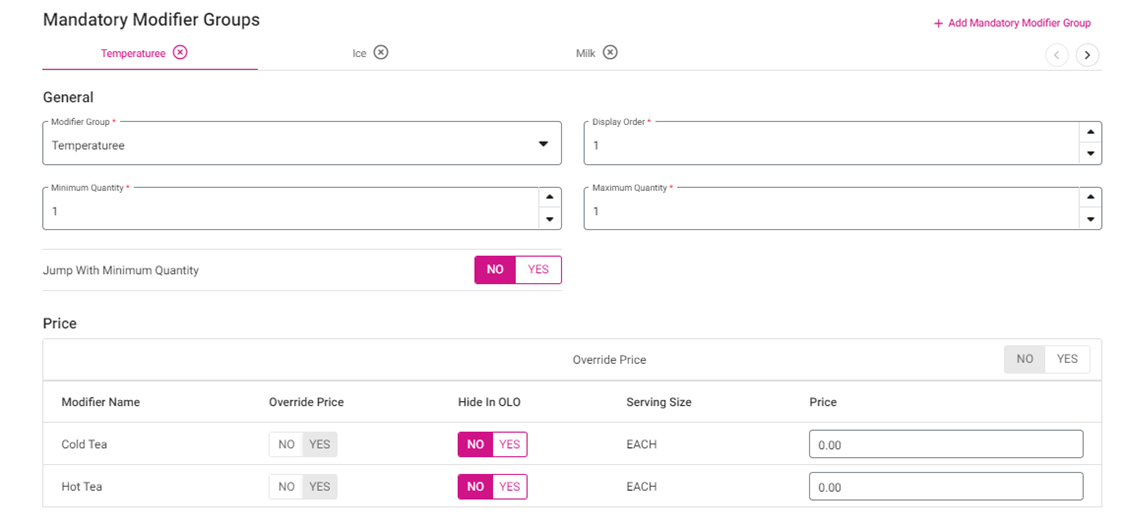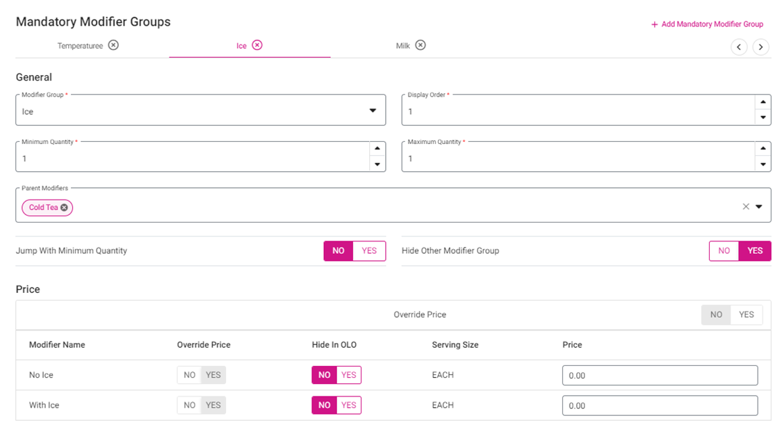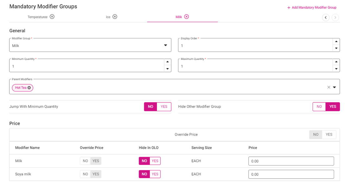 Upon clicking on Active Check, you will be able to view the table where the Parent Modifier Configuration will be reflected in Net Sale amount and tax need to be calculated based on the price and tax configured in BO.