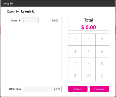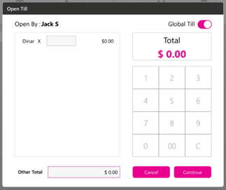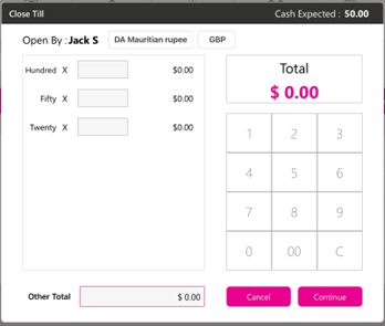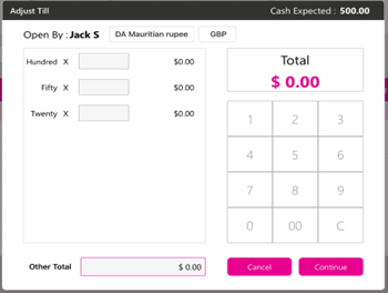 Upon entering the numerical value in the number pad screen, the denomination marked in Back Office will appear in the Open Till page.