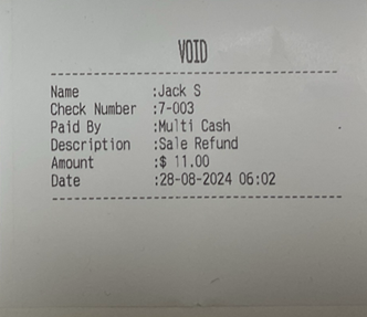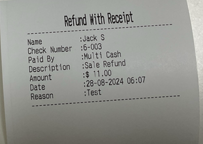The Check will be refunded with the value entered in the POS screen using Multi Cash refund method.