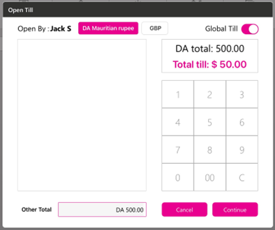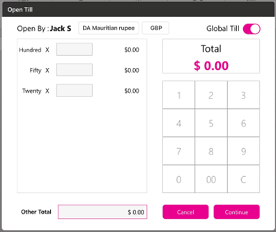 The denominations created in Till settings will appear in the Open Till.
